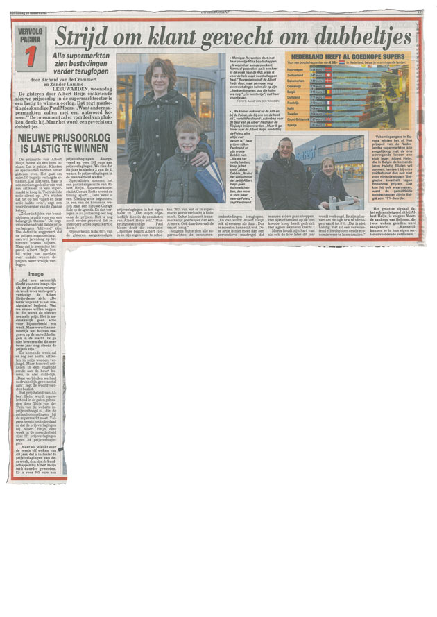 LEEUWARDEN - De gisteren door Albert Heijn ontketende nieuwe prijsoorlog in de supermarktsector is een lastig te winnen oorlog. Dat zegt marketingdeskundige Paul Moers: "Want andere supermarkten zullen met een antwoord komen." De consument zal er voordeel van pakken, denkt hij. Maar het wordt een gevecht om dubbeltjes.Nieuwe prijsoorlog is lastig te winnen